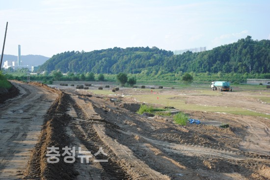 유성구 구즉동에 위치한 갑천 한빛대교 하류 좌안 하천둔치에 조성중인 파크골프장은 30℃가 넘는 폭염속에서 조성공사가 한창 진행중이었다.