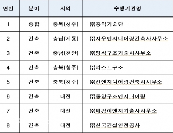 시는 지난 8월부터 이달 2일까지 안전진단 전문기관 중 대전·세종·충남·북에 소재한 ‘건축’, ‘종합’ 분야 등록 업체를 대상으로 점검기관 공개모집을 실시했다.
