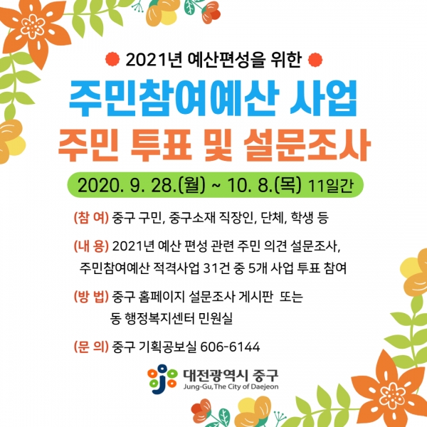 대전 중구(구청장 박용갑)는 2021년 예산편성을 위한 주민참여예산 사업(총 7억원 규모) 주민 투표와 설문조사를 이달 28일부터 10월 8일까지 11일간 진행한다.
