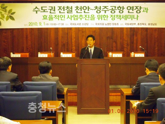 9월 1일 금일 오후 3시 국회도서관 소회의실에서 노영민 의원(민주당, 충북 청주)과 양승조 의원(민주당, 충남 천안갑) 공동 주최로, '천안 ~ 청주공항간 수도권 전철 연장과 효율적 사업추진을 위한 정책세미나'가 열렸다.