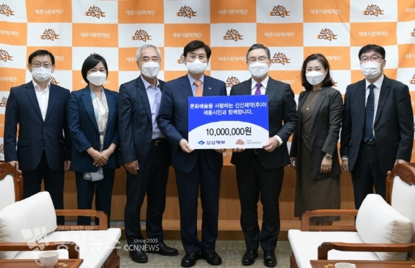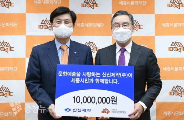 신신제약(대표이사 이병기)이 8일 세종시청 접견실에서 (대표이사 김종률)에 문화예술후원금 1천만 원을 전달했다.