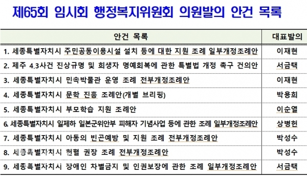 유철규 세종시의회 행정복지위원장은 13일 언론 브리핑을 통해 "15 ~ 23일까지 개회되는 제65회 임시회에서는 16건의 조례안, 12건의 동의안, 1건의 건의안에 대한 안건 처리가 이루어 질 예정"이라고 밝혔다.