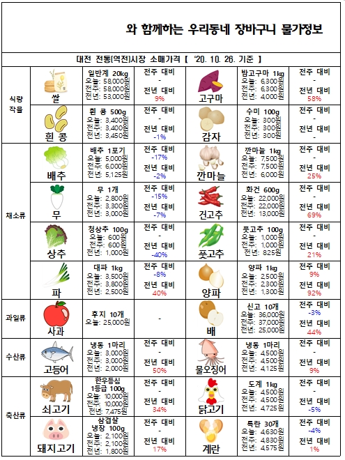 한국농수산식품유통공사 대전세종충남지역본부(aT, 본부장 김달룡)는 대전지역 농수산물 소비자의 합리적 구매를 지원하고 전통(역전)시장의 활성화를 위해 우리동네 장바구니 물가정보(10월 넷째주)를 발행하였다.