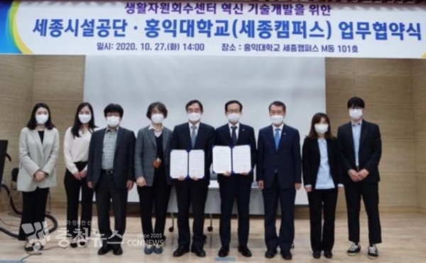 세종특별자치시시설관리공단(이사장 계용준)은 홍익대학교 세종캠퍼스와 27일 생활자원회수센터 혁신 기술개발을 위한 업무협약을 체결했다.