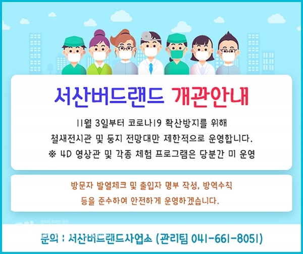 최평수 서산버드랜드사업소장은 “안전한 시설 이용을 위해 마스크 착용 등 방역수칙을 준수해 주시길 부탁드린다”라며 “시민의 안전을 최우선으로 운영해나가겠다”라고 말했다.