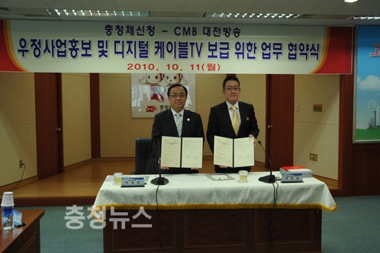 충청체신청(청장 이상진)은 11일 체신청 4층 대회의실에서 CMB대전방송(대표이사 이한성)과 우정사업 홍보 및 디지털 케이블TV보급을 위한 업무협약을 체결했다고 밝혔다.
