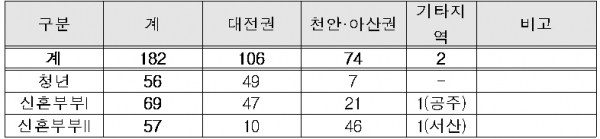 모집물량은 총 182호로 청년 56호, 신혼부부 126호로 대전 106호, 천안·아산 74호, 기타 지역 2호가 공급되며, 11월 중에 입주신청을 하여 당첨될 경우 청년과 신혼부부 모두 연내에 순차적으로 입주가 가능하다.