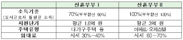 신혼부부 매입임대주택은 다가구주택 등에서 시중임대시세 대비 30~40%로 거주할 수 있는 Ⅰ유형(69호)과 아파트‧오피스텔 등에서 시중임대시세 대비 60~70%로 거주할 수 있는 Ⅱ유형(57호)으로 나누어 공급한다.