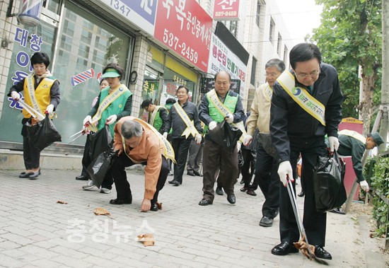 ▲ 거리청소를 하고 있는 박환용 청장과 주민 등