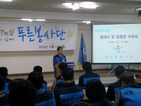 이날 행사는 윤석만 시당위원장을 비롯한 대전시당 주요당직자와 이병배 푸른봉사단장과 봉사단원 100여명이 참석하여 푸른봉사단 출범과 함께 봉사단 임원진을 대상으로 임명장 수여식을 가졌다.