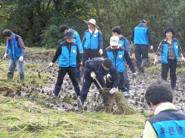푸른봉사단원 100여명은 출범식 직후 동구 신하동 인근에서 강풍으로 쓰러져 추수를 하지 못한 체 쓰러져 있는 벼를 베는 봉사활동을 참여했다.