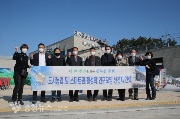천안시의회(의장 황천순) '천안시의회 도시농업 및 스마트 팜 활성화 연구모임'(이종담 대표의원, 김선태, 김월영, 이은상, 육종영, 배성민)은 시 관계부서 공무원과 함께 11일 도시농업과 스마트 팜을 천안시에 적용 위한 비교견학으로 태안군 유기작물농장 서유채와 로컬푸드직매장을 찾았다.