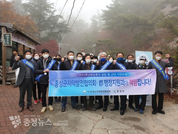 14일 홍성군청 행정지원과 직원과 지역발전협의회회원 등 30여명은 홍북읍 용봉산 등산로 3곳에서 등산객을 대상으로 KBS충남방송총국 설립을 위한 범 군민 서명운동을 전개하며 분위기 조성에 앞장서는 시간을 가졌다.