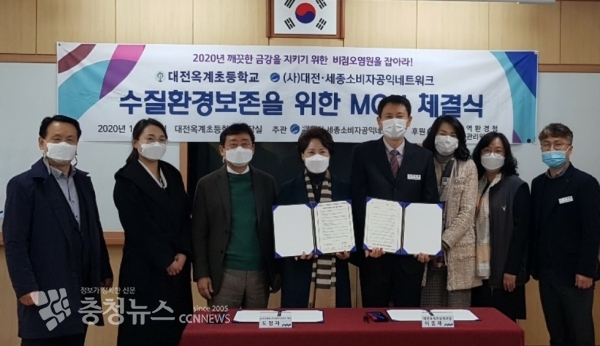 (사)대전세종소비자공익네트워크(회장 도정자)는 금강유역환경청(청장 박하준)의 협력사업의 일환으로 23일(월) 대전옥계초등학교(교장 이중재)에서 수질환경보존을 위한 업무 협약식 및 비점오염홍보캠페인을 펼쳤다.