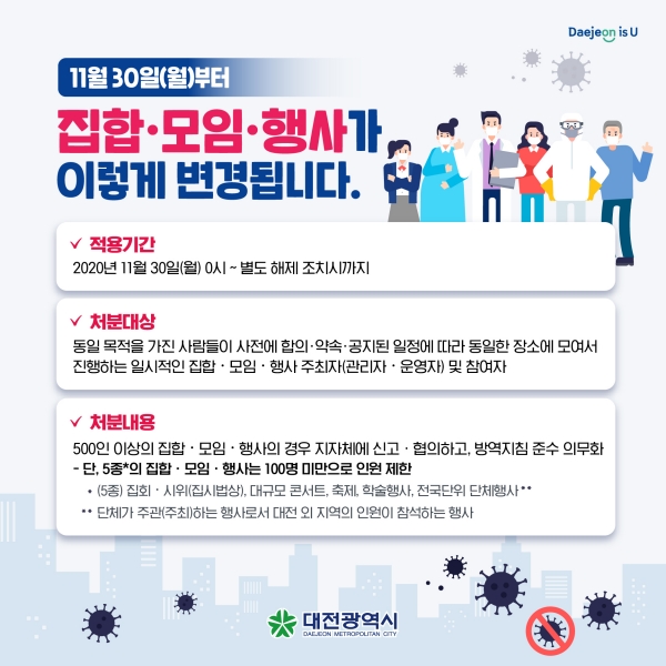 특히 이번에 규제되는 전국단위 단체행사란 단체가 주관(주최)하는 행사로서 대전 외 지역의 인원이 참석하는 행사를 말한다.