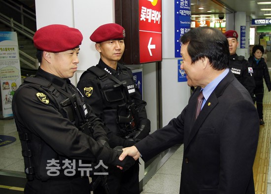 대전시 염홍철 시장은 9일 오전 8시 30분 대전역 경비를 서고 있는 G20 대비 비상근무 경찰을 위문했다.