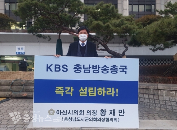 아산시의회 황재만 의장이 22일 서울 KBS 본사 앞에서 KBS 충남방송총국 설립을 촉구하는 충남시군의회 의장협의회 1인 릴레이 시위에 나섰다.