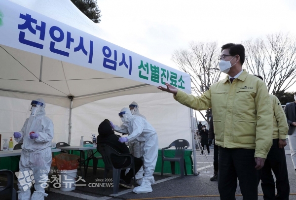 천안시 선별진료소에서는 천안 지역 코로나19 확진자 및 검사 현황을 듣고, 최일선에서 근무 중인 관계자들을 격려했다.