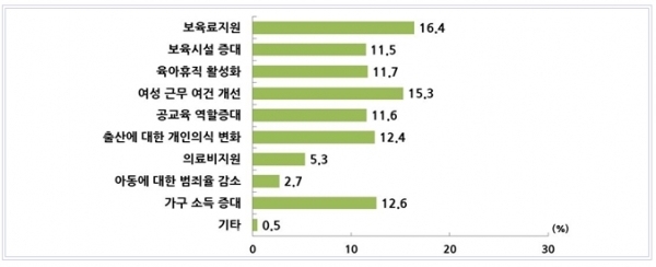 출산율 증가를 위한 선행 사항으로는 ‘보육료 지원’이 16.4% 가장 높았고, 다음으로‘여성 근무 여건 개선(15.3%)’, ‘가구 소득증대(12.6%)’, ‘육아휴직 활성화(11.7%)’ 순으로 조사됐다.