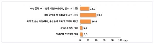 장애인 복지향상을 위해 필요한 사업으로는 ‘일자리 확대 및 지원’이 29.2%로 가장 높았고, 여성을 위한 복지사업도 ‘여성일자리확대(취업 및 교육지원)’가 39.5%로 가장 많았다.