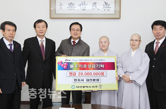 대전시 서구(구청장 박환용)는 변동에 위치한 영산불교유지재단 현지사 대전분원(원장 혜명스님)이 8일 서구청을 방문, 이웃돕기 성금 2천만원을 기탁했다고 밝혔다.