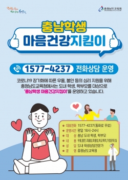 충남교육청(교육감 김지철)은 코로나19로 인해 우울, 불안, 자해가 급증함에 따라 마음건강의 위험 신호를 조기에 발견하고 신속한 치유를 위해 학생 마음건강지킴이 전화(1577-4237) 상담을 운영한다.