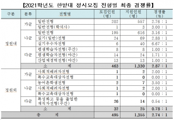 한밭대「2021학년도 신입생 정시모집」전형별 최종 경쟁률은 다음과 같다.