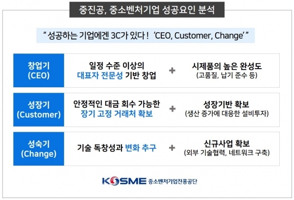 중진공은 2017년부터 2018년까지 2년 간 정책자금을 지원받은 기업 3만개 사에 대한 기업평가 데이터를 분석했다. 기업의 성장 단계를 창업기, 성장기, 성숙기 등 3단계로 나누고, 각 단계별로 주요한 성공요인을 뽑아 3C(CEO, Customer, Change) 전략을 제시했다.