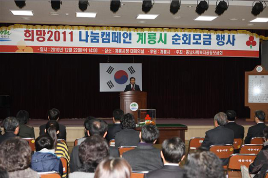 충청남도 계룡시(시장 이기원)는 지난 22일 충청남도사회복지공동모금회와 공동으로 이루어진 ‘희망2011 나눔캠페인’을 성황리에 마쳤다고 밝혔다.