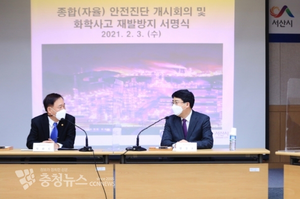 지난해 7월 맹정호 서산시장이 고용노동부 및 대산6사와 ‘화학사고 예방 간담회’를 통해 근본적인 개선책을 마련코자 강력히 종합자율안전진단을 건의한 결과다.