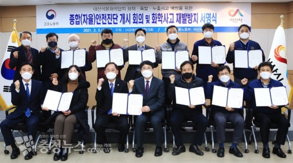 시는 3일 대산읍 행정복지센터에서 고용노동부 및 한화토탈, LG화학 등 대산6사와 종합자율안전진단 착수보고회 및 대산 산단 화학사고 근절 공동결의 서명식을 가졌다.
