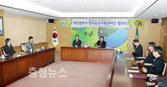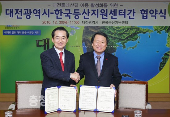 염홍철 대전광역시장과 최홍건 한국등산지원센터 이사장은 30일 오전 11시 시청 중회의실에서 대전둘레산길 이용 활성화와 건전한 등산 ․트레킹 문화 확산을 통한 시민의 삶의 질 향상 및 상호 우호 협력 체계를 공고히 하기 위해 업무협력 협약식을 가졌다.