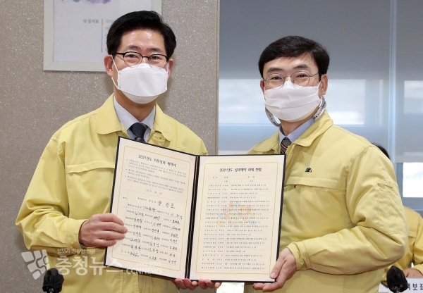 김하균 기획조정실장은 정부예산 확보 및 가시적 도정성과 창출 등 2건을, 이정구 재난안전실장은 재난위험시설 및 재해예방 사업 선제적 대응을 약속했다.
