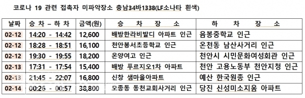 아산시는 코로나 19 관련 접촉자 미파악 장소를 공개했다.(충남34바1338(LF소나타 흰색))