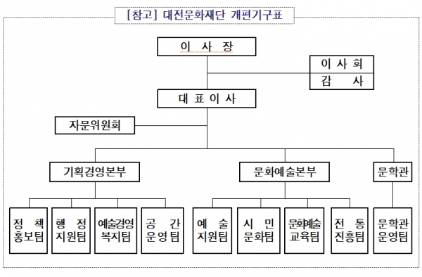 대전문화재단은 지난 2월 26일 열린 정기이사회에서 조직개편안에 따른 ‘직제 및 정원 규정 개정안’ 등을 의결하고 본격적인 조직개편 절차에 돌입했다.