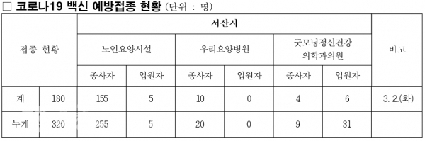 이로써 서산시는 65세 미만 요양․정신병의원 및 요양시설 20개소, 661명중 320명을 예방접종해 누계실적은 48.4%이다.