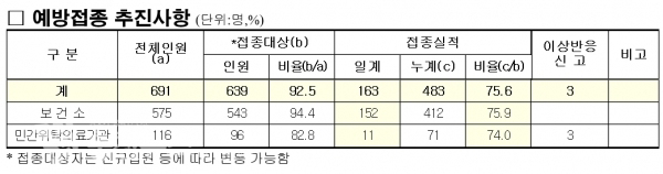 이로써 서산시는 65세 미만 요양․정신병의원 및 요양시설 20개소, 639명중 483명을 예방접종해 누계실적은 75.6%이다.