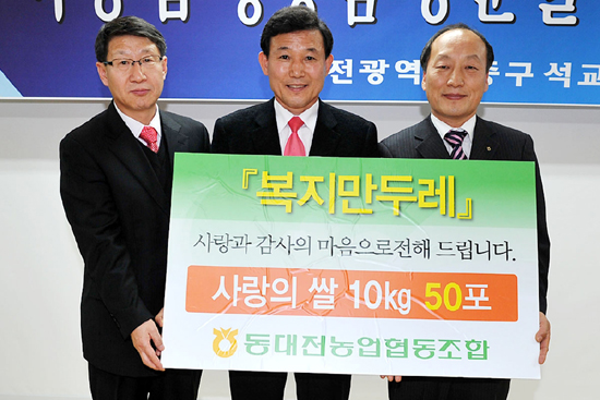 대전시 중구(구청장 박용갑) 동대전농협(조합장 김영기)에서 13일 연일 이어지는 추위로 어려움을 겪고 있는 주민들을 위해 써달라며 석교동을 방문해 백미 500kg(100만원 상당)을 전달했다.