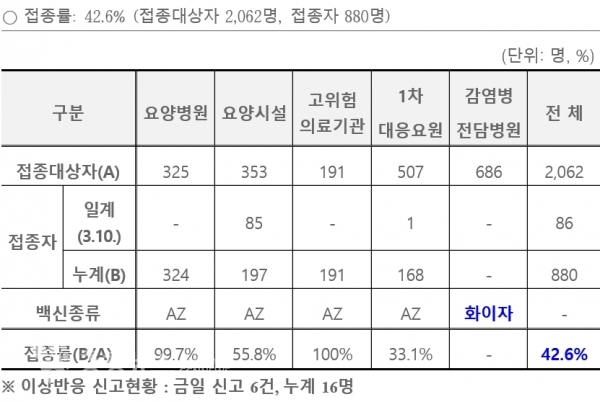 한편, 10일 오후 3시 기준 세종시 코로나19 백신접종 현황은 접종대상자 2062명 중 접종자는 880명으로 접종률은 42.6%를 보이고 있다.
