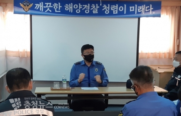 16일 첫날 신진 전용부두내 함정과 신진파출소 근무자들을 대상으로 공직기강 확립교육에 나선 윤 서장은 부정청탁 및 향응뇌물 수수를 비롯해 성희롱, 음주운전, 갑질 등 공직자 주요 4대 비위 사례를 중심으로 공무원 행동강령 준수사항들을 재차 강조했다.