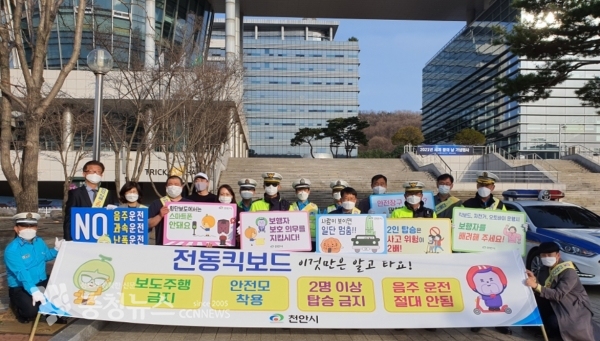 천안시는 19일 오후 불당동 일원에서 안전한 전동 킥보드이용 문화 조성을 위해 민‧관‧경 합동 캠페인을 펼쳤다.