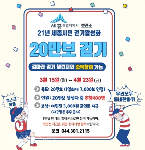 세종특별자치시보건소(소장 권근용)가 모바일 앱 ‘워크온’을 활용한 ‘3~4월 20만보 걷기 챌린지’를 운영한다.