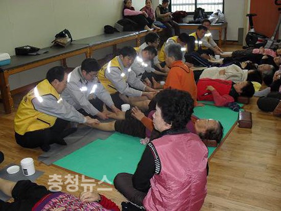 대전둔산경찰서 둔산지구대(지구대장 경감 박도수)는 21일 오전 서구 탄방동 1084번지 서구노인복지회관(관장 장곡스님)에서 시설 환경정리, 발맛사지 및 생필품 전달 등 관내 노인들에 대한 사랑나눔 봉사활동으로 소외계층을 위해 정성을 다하는 친근한 경찰상을 구현했다.