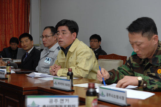 시는 21일 오전 공주시 농업기술센터 구제역 종합상황실에서 공주지역 유관 기관단체장들이 참석한 가운데 구제역 발생 대책회의를 열고 정치리 농장이 미칠 파장 등에 대한 논의와 함께 대응방안을 놓고 장시간 마라톤 회의를 벌였다.