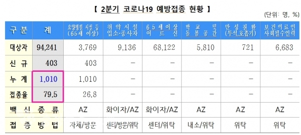 접종 대상자는 3,769명이며, 현재까지 1,010명이 접종을 완료하여 26.8%의 접종률을 보이고 있다. 이들은 10주의 간격을 두고 아스트라제네카 백신을 2회 접종받게 된다.