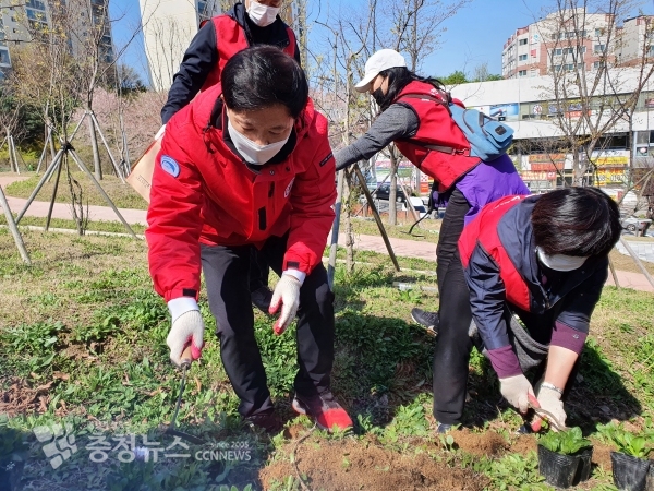 국민의힘 천안을 당원협의회(위원장 이정만)자원봉사단 `함께하는 천안의힘`(단장 정도희 시의회부의장)은 이정만 당협위원장을 비롯하여 정도희 단장, 유영진. 이준용, 김철환 시의원 등 회원 30여명이 식목일을 맞아 시민공원 꽃길 조성 활동을 펼쳤다.