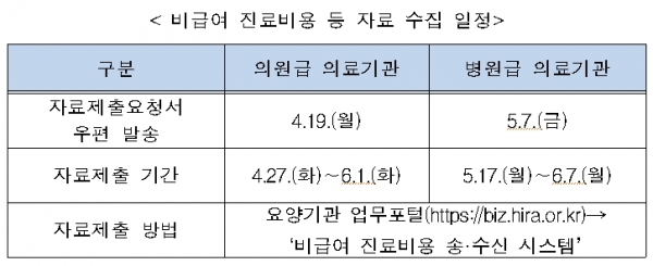 비급여 진료비용 등의 자료수집 일정은 의원급 의료기관은 4월 27일부터 6월 1일까지, 병원급 의료기관은 5월 17일부터 6월 7일까지이며, 자료 자료제출 방법 등 자세한 안내사항은 심사평가원 누리집(www.hira.or.kr) 또는 요양기관업무포털 공지사항에 게재할 예정이다.