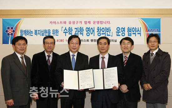 유성구는 8일 오후 2시 카이스트에서 손성도 부구청장과 최병규 교학부총장 등 양 기관 관계관들이 참석한 가운데 저소득층 자녀를 위한 ‘수학・과학・영어 창의반 운영’ 업무협약을 체결하고 상호 협력해 나가기로 합의했다.