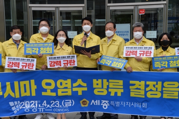 세종특별자치시의회(의장 이태환)가 23일 의회청사 앞에서 일본 정부의 후쿠시마 원전 오염수 해양 방류 결정을 강력히 규탄하고 오염수 방류 결정 철회를 촉구하는 성명서를 발표했다.