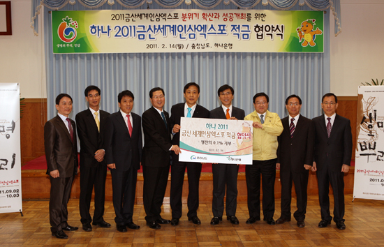 한편, 하나은행은 지난달 13일「2011금산세계인삼엑스포 성공기원 후원금」으로 1억원을 기탁했으며, 앞서 지난 2009안면도국제꽃박람회와 2010세계대백제전에 3억원과 입장권, 지난 99년 이래 충남도청 핸드볼팀에 매년 3억원과 각종 도 행사 등에 적극 지원해오고 있다.